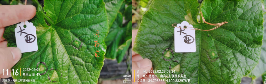 競雙750倍+2%春雷霉素750倍防治黃瓜細(xì)菌性角斑病,4條后病斑得到抑制未見擴(kuò)散。